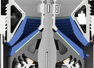Большое расстояние между конусом и стеной конуса, допускается поступление большего количества материала,а также формирование большого объема разгрузки скорость прохода материала.03/ Параметры